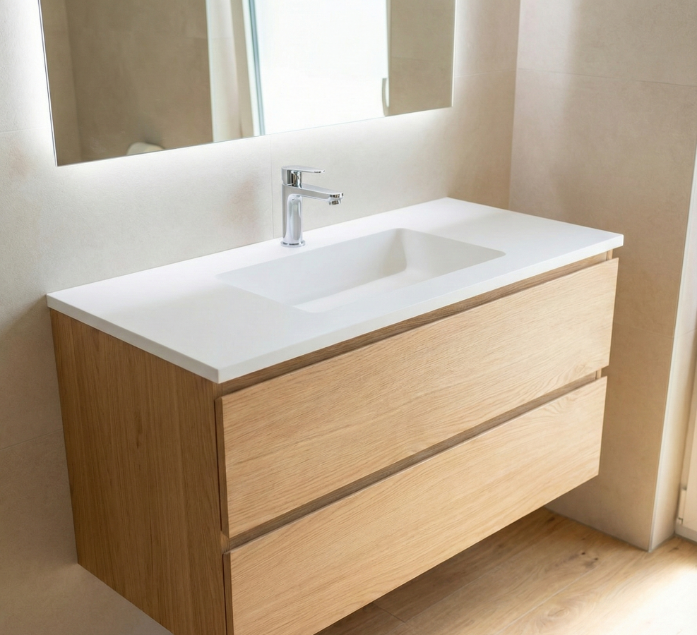 La pieza central de tu baño. Este conjunto incluye un mueble suspendido de dos cajones con guías de cierre amortiguado, fabricado en madera tratada para resistir la humedad. La joya del mueble es su encimera de resina hidrófuga de una sola pieza con lavabo integrado, que elimina las juntas para facilitar la limpieza y ofrecer un acabado estético continuo y sofisticado.
